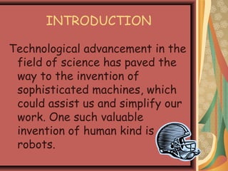 Robots are machines that are programmed to perform tasks without human assistance. They were first used in ancient Greece and Egypt to perform manual labor. Today, robots are used in many fields to assist humans. They are used in medicine to perform complex surgeries, in the military to reduce human casualties during war, for domestic tasks like cleaning, and in factories for dangerous industrial work. While robots have advantages like accuracy and efficiency, they also have limitations such as high costs and an inability to be creative or make independent decisions.