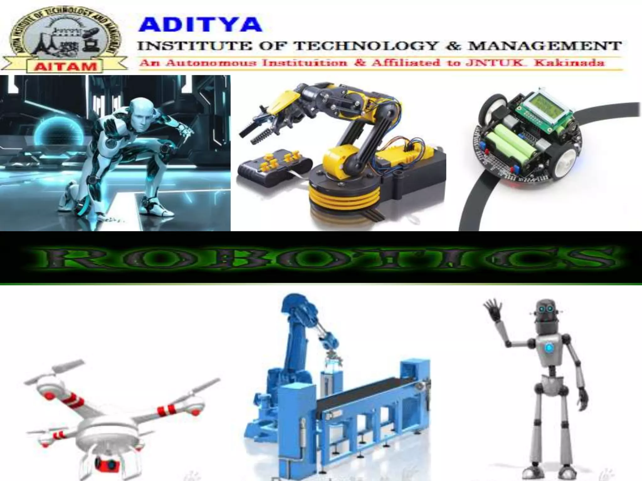 Robots are re-programmable machines that can perform hazardous tasks like removing mines or working in space. The field of robotics involves designing and building robots. The word "robot" was coined in 1920 by Karel Capek in his play R.U.R., while the term "robotics" was coined by Isaac Asimov in the 1940s. George Devol invented the first digital and programmable robot called Unimate in 1954 to lift hot metal from die casting machines. Robots typically have sensors, effectors, actuators, controllers, processors and arms. Common types of robots include mobile, stationary, autonomous, and virtual robots.