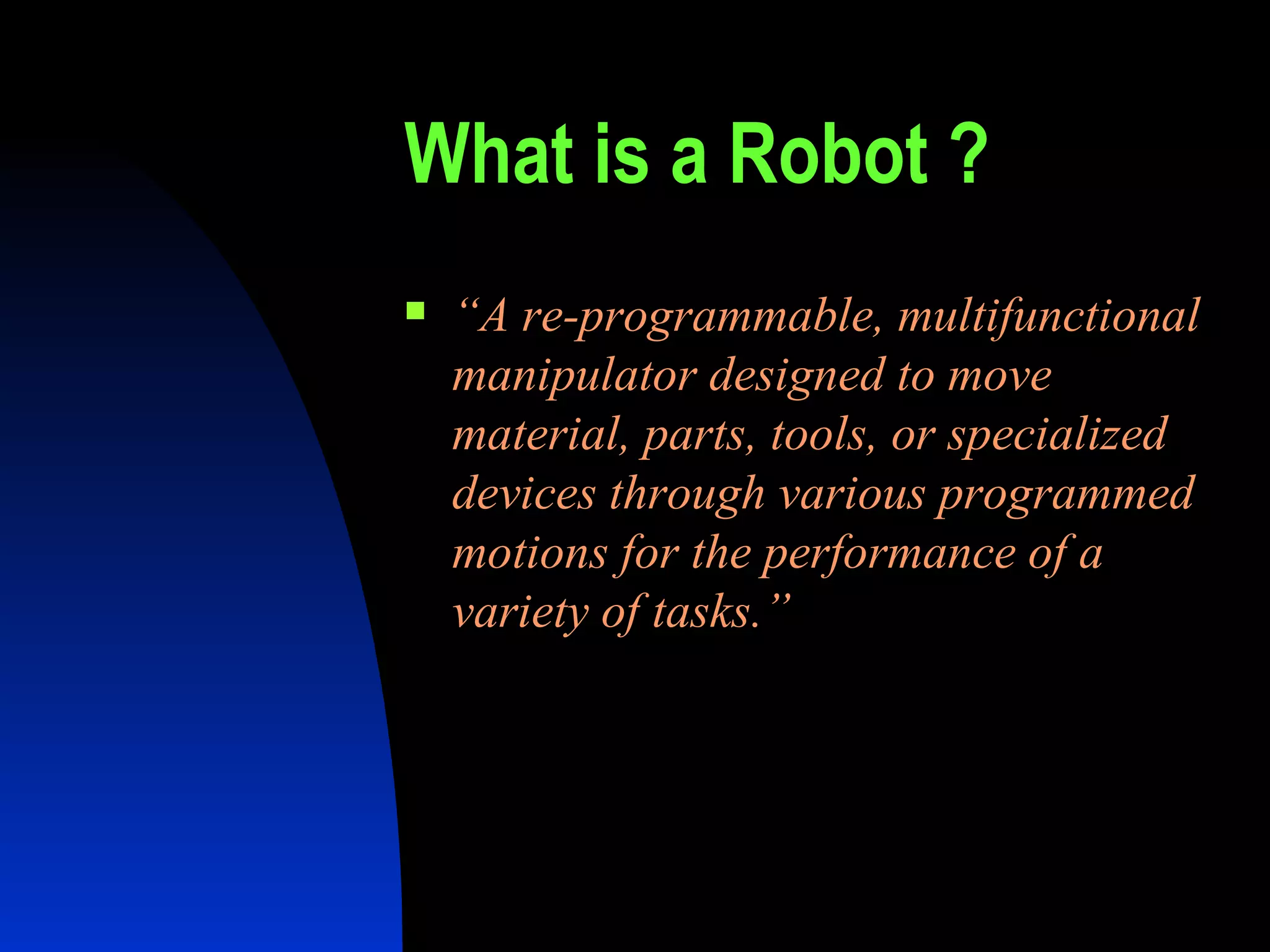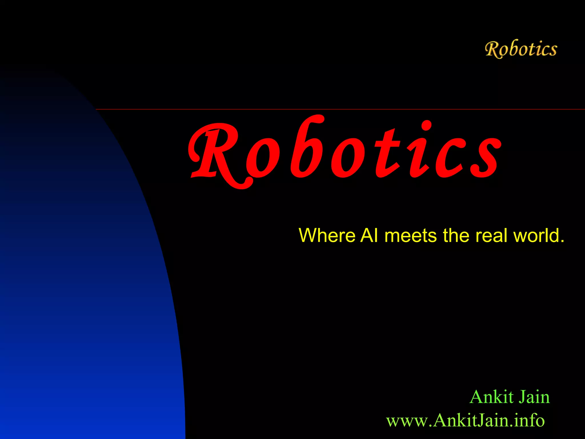 This document provides an overview of robots, including their essential characteristics of mobility, programmability, sensors, mechanical capability, and flexibility. It discusses Isaac Asimov's Three Laws of Robotics, the construction and working of robots involving mechanical platforms, sensors, motors, and electronic controls. It also covers applications of robots in safety, industrial uses, space, and the future possibilities of artificial neural networks and self-training robots.