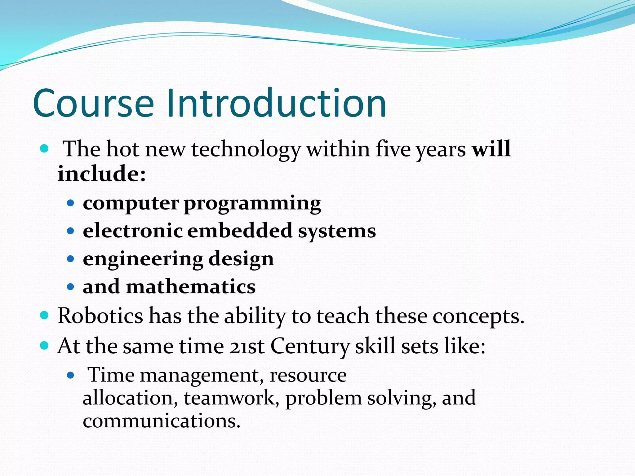 This document introduces a robotics course that will teach computer programming, embedded systems engineering, design, and mathematics concepts using robotics projects. Students will develop 21st century skills like time management, teamwork, and problem-solving. The course will cover the Three Laws of Robotics, robot hardware and software, programming syntax, sensor integration, and synchronized motor control. Safety practices will be emphasized. Students will design, build, test, and evaluate robots to complete challenges. The instructor has 18 years experience and is excited to teach robotics concepts.