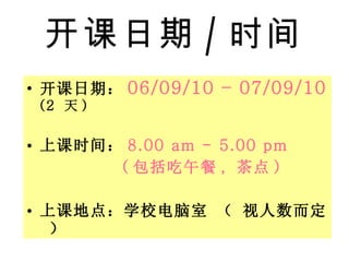 开课日期: 06/09/10 – 07/09/10 (2 天 ) 上课时间: 8.00 am - 5.00 pm ( 包括吃午餐 , 茶点 ) 上课地点:学校电脑室 ( 视人数而定 )
