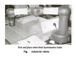 The document discusses different types of actuators used in robotics, including pneumatic, hydraulic, and electric actuators. Pneumatic actuators use compressed air and have advantages of low cost and easy control but lack precision. Hydraulic actuators can apply large forces with high power-to-size ratios but require complex servo control and have risks of leakage and fire. Electric actuators are now most common and include stepper motors for position control and DC motors for applications requiring higher power and torque control. The document compares characteristics of different actuator types for robotic applications.