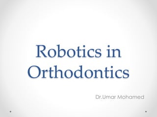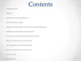 This document provides an overview of robotics applications in orthodontics. It discusses the history of robotics and various robots that have been developed for tasks like wire bending, appliance fabrication, and manufacturing of aligners. Wire bending robots can precisely bend archwires to customized specifications to improve treatment accuracy and efficiency. Robots are also used for digital fabrication of splints and may have future applications in areas like nano robots and research. Overall, robotics is allowing orthodontists to spend more time on diagnosis and planning rather than appliance production tasks.