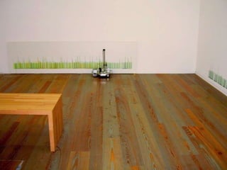 The document summarizes and compares several robots created for artistic purposes. Translator II is a robot created by Sabrina Raaf that uses a CO2 sensor to monitor air quality and draws pictures based on CO2 levels, providing a record of environmental conditions over time. Profiler is an interactive robot installation by Robotlab that exposes humans to industrial robots in a public setting. Fish, Plant, Rack is an artwork by Andy Gracie featuring interaction between a fish, plant and robot controlled by an AI microcontroller.