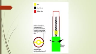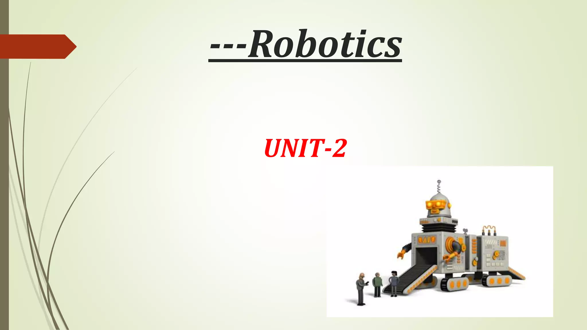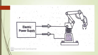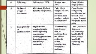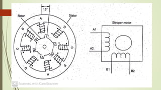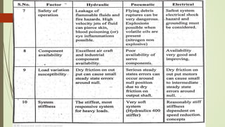 The document discusses various types of robot drive systems and end effectors. It describes hydraulic, pneumatic, and electric drive systems. Hydraulic drives use pressurized fluid and are suitable for heavy loads. Pneumatic drives use compressed air and are cheaper but generate more noise. Electric drives include AC servo motors, DC servo motors, and stepper motors. Stepper motors convert electrical pulses to rotational movement precisely. Servo motors are used in automatic control systems. The document also discusses actuators, motors, and end effectors like grippers used by robots.