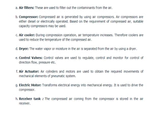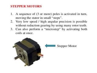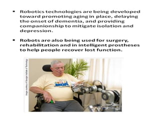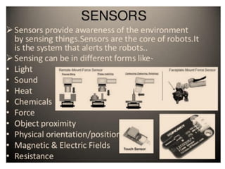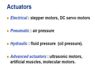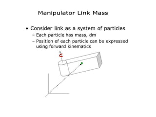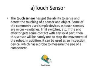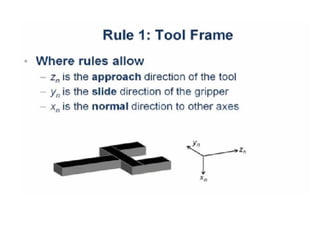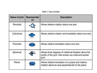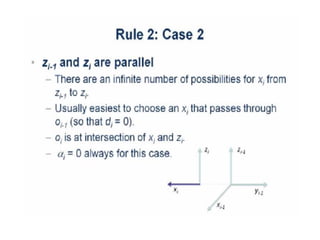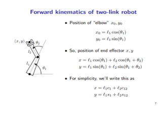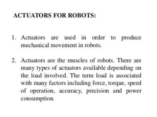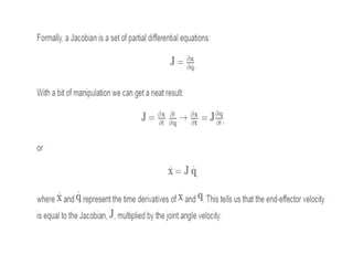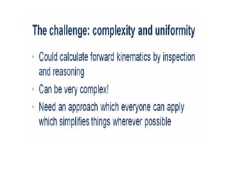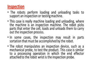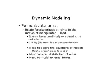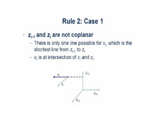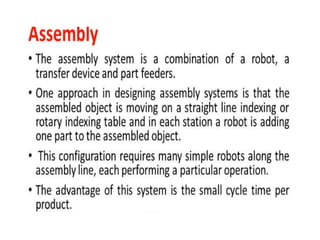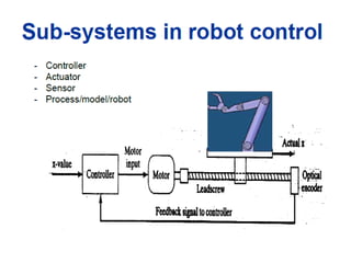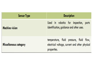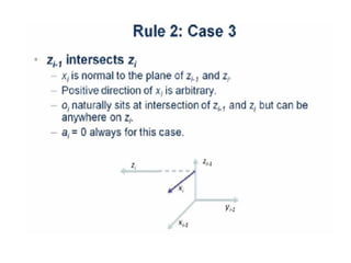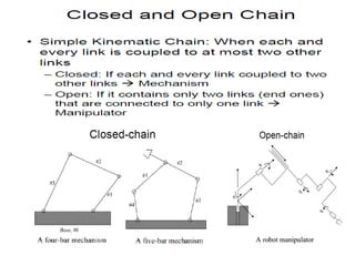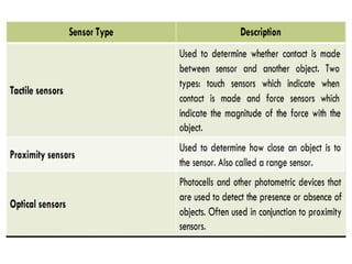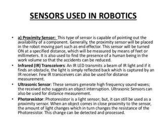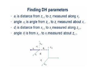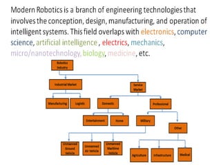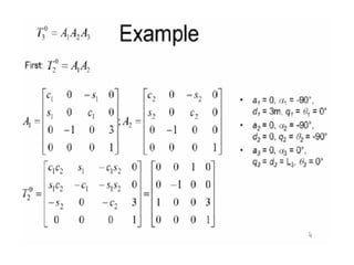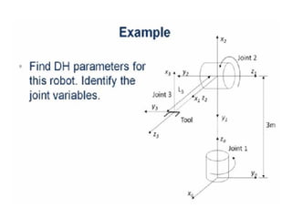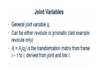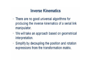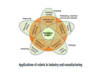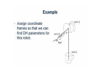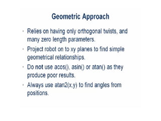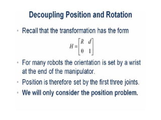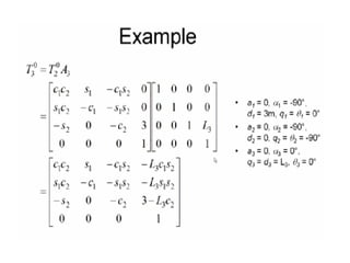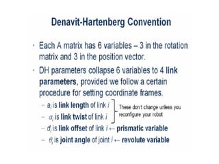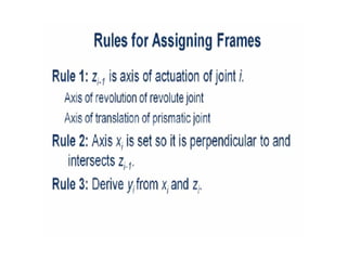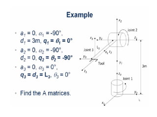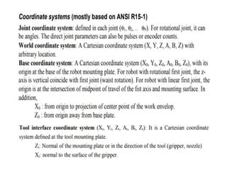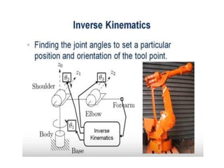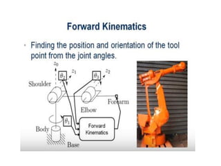This document provides information about robotics engineering as a professional elective. It begins with definitions of robotics and industrial robots. It then discusses various components of industrial robots including manipulators, sensors, tooling, and controllers. It describes different types of robot configurations including Cartesian, cylindrical, polar, and jointed-arm. It also covers topics like drive systems, specifications, applications, and the Denavit-Hartenberg convention for representing robot kinematics.