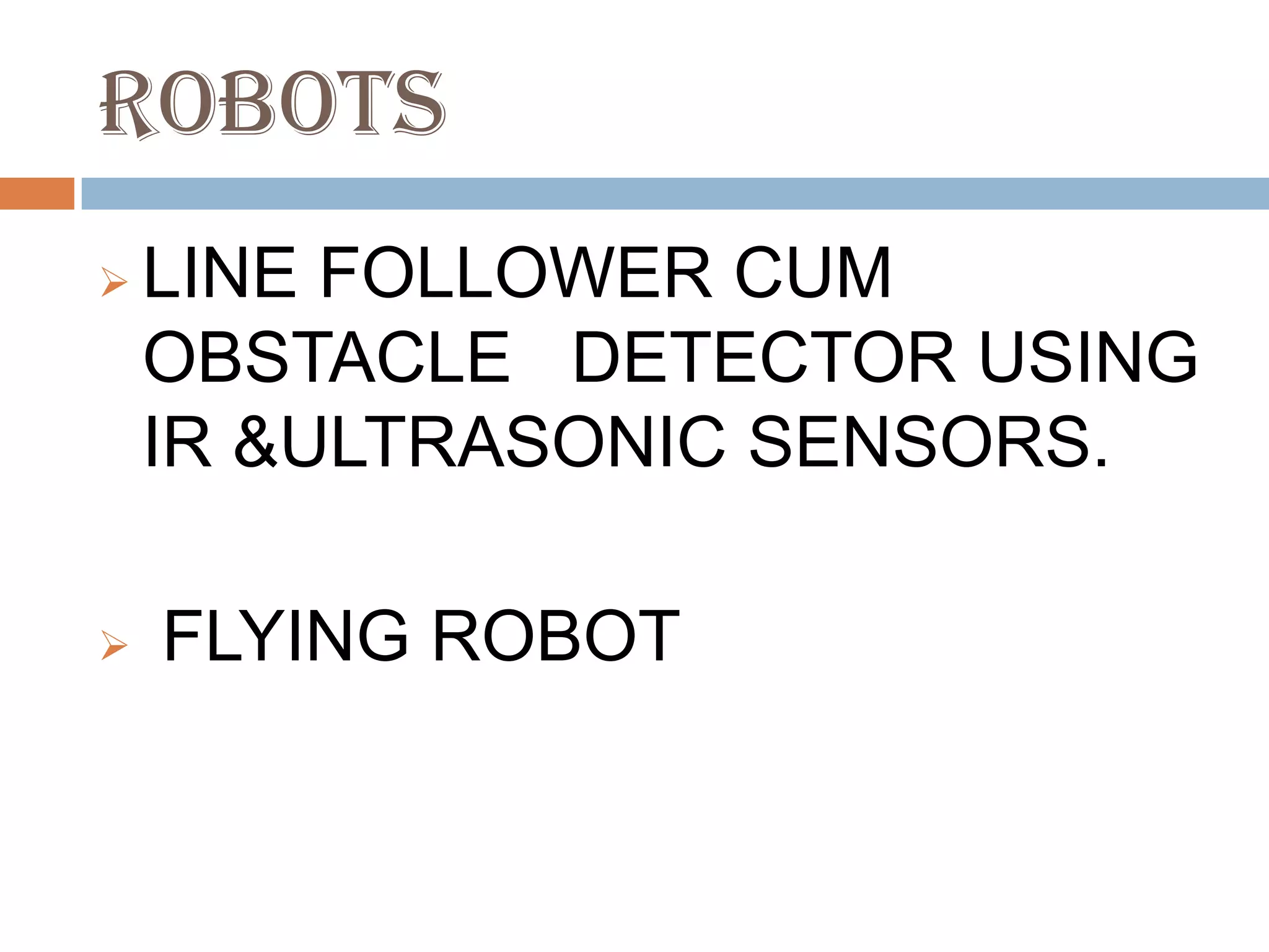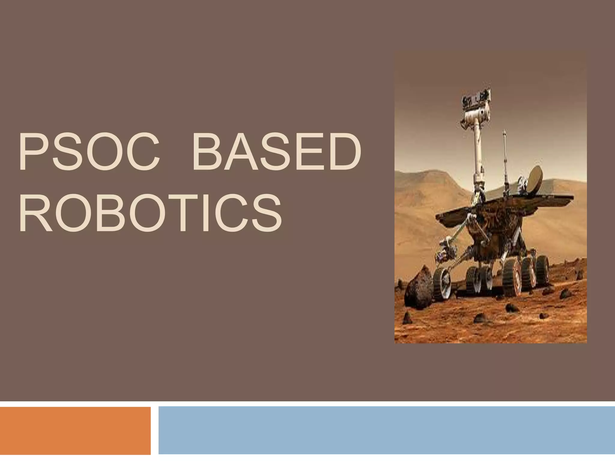 This document discusses two robotics projects: a line follower robot that can also detect obstacles using IR and ultrasonic sensors, and a flying robot. The line follower uses IR sensors to detect the contrast between black and white surfaces to follow a line, and ultrasonic sensors are added to enable obstacle detection. A block diagram shows the IR sensors, ultrasonic sensors, PSoC conditioning, motor driver, and display. The flying robot uses a four rotor design with PWM for motion control and synchronization. It also includes IR sensors, PSoC, motor control, and display in its block diagram. Potential applications discussed are surveillance, data acquisition, image processing, and integrating additional technologies like Wi-Fi, IP cameras, and GPS.