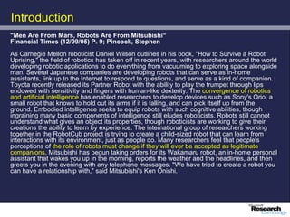 The document discusses advancements in robotics, emphasizing the development of personal and home assistant robots that enhance daily living and interaction. It highlights various projects, such as the robotcub initiative aimed at creating learning robots, and addresses the need for improved programming environments to facilitate robot interaction in everyday life. The text concludes with considerations on the emotional interaction between humans and robots, underlining the importance of social dynamics in robotics.