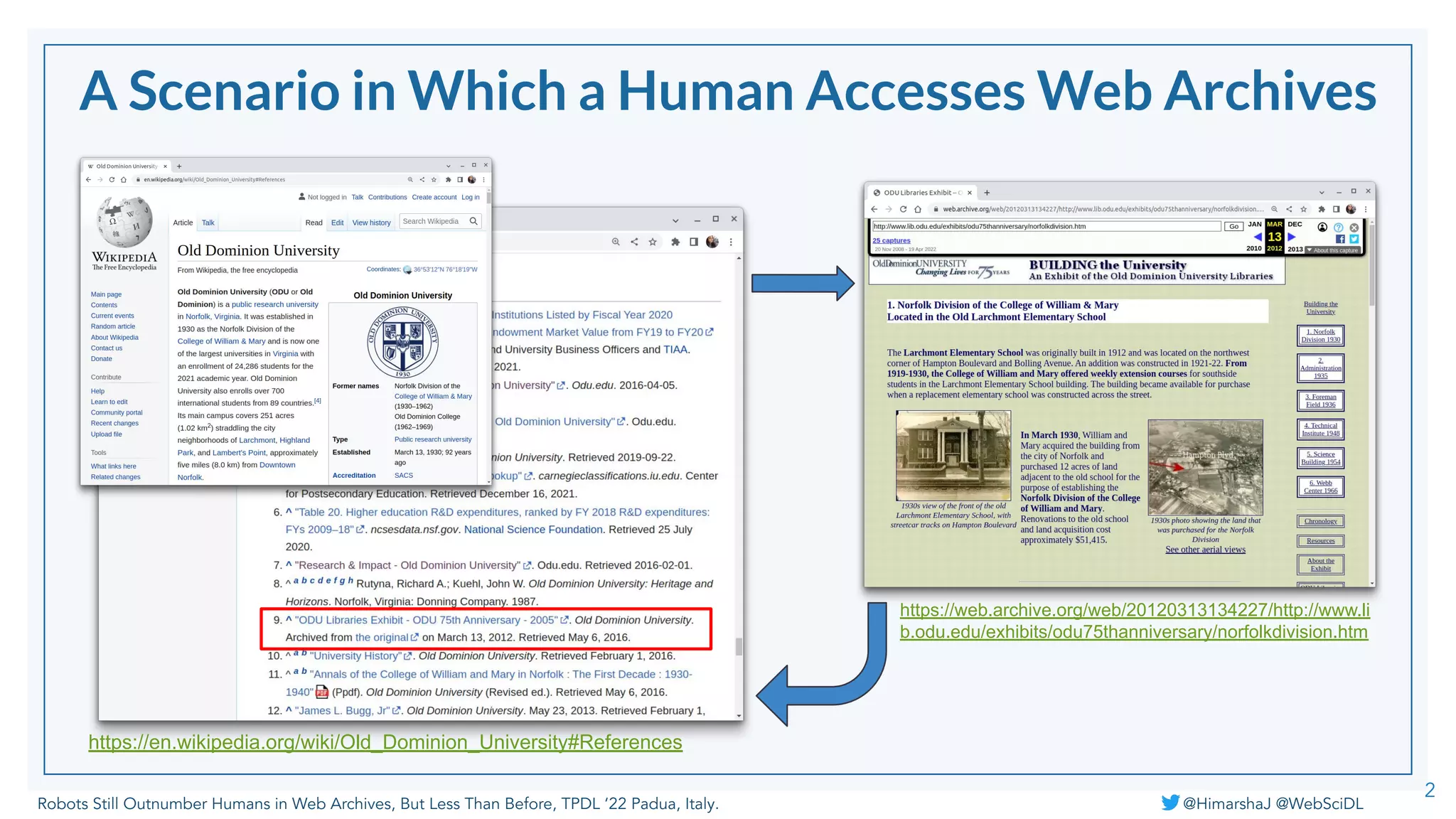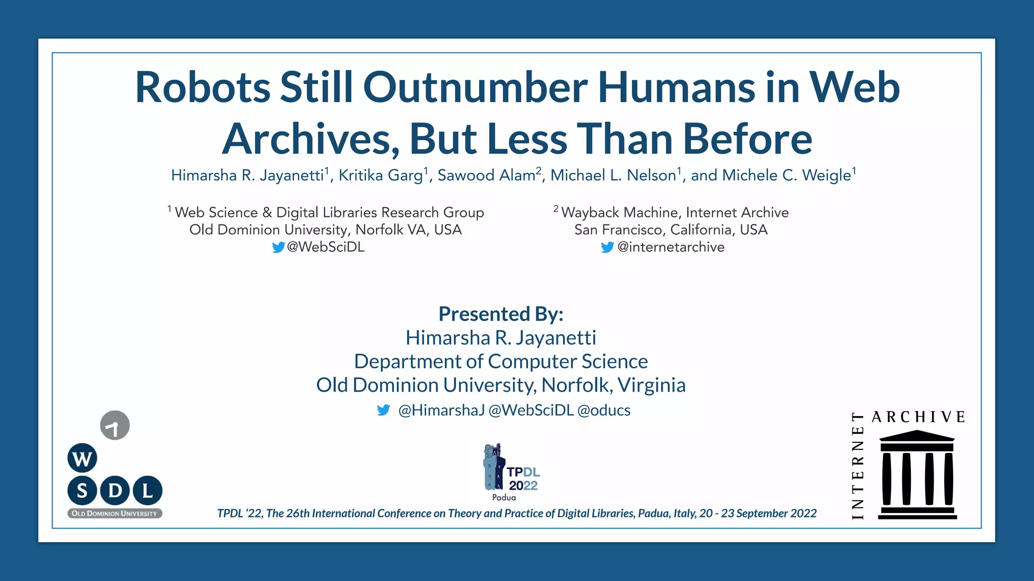 The document presents findings on the access patterns of robots and humans in web archives, illustrating that while robots still outnumber humans, the ratio has decreased. It highlights various metrics, such as requests and status codes from access logs, demonstrating trends over time. Notably, the study proposes distinct user access patterns and confirms that bots access timemaps while humans tend to access mementos.