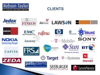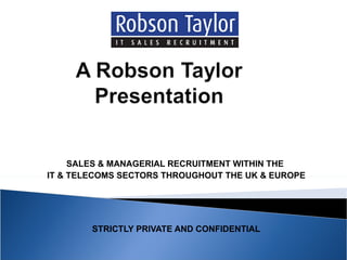 This document provides an overview of Robson Taylor, a UK-based recruitment consultancy specializing in sales and managerial professionals within the IT and telecom sectors. It details the company's history and accreditations, leadership team, services offered including database searches and networking, types of roles filled, benefits of using their services, case studies of clients and roles filled, and positive client testimonials.
