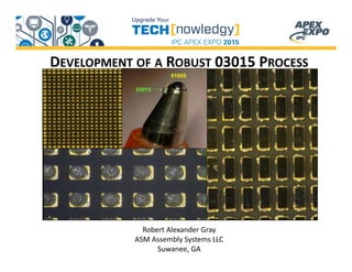 This document summarizes the development of a robust SMT process for placing 03015 components, which are only 0.3mm x 0.15mm in size. Through testing different solder pastes and stencil materials, the author developed a process using a laser-cut fine grain stainless steel stencil with an electro polish and nano coating that achieved over 80% transfer efficiency. Taguchi experiments were used to optimize print parameters. Initial tests achieved placement of 03015 components with 0 defects out of 36,000 placements. The printing process achieved a DPMO of 15. Further work is still needed to optimize the process for thinner stencils required by smartphones.