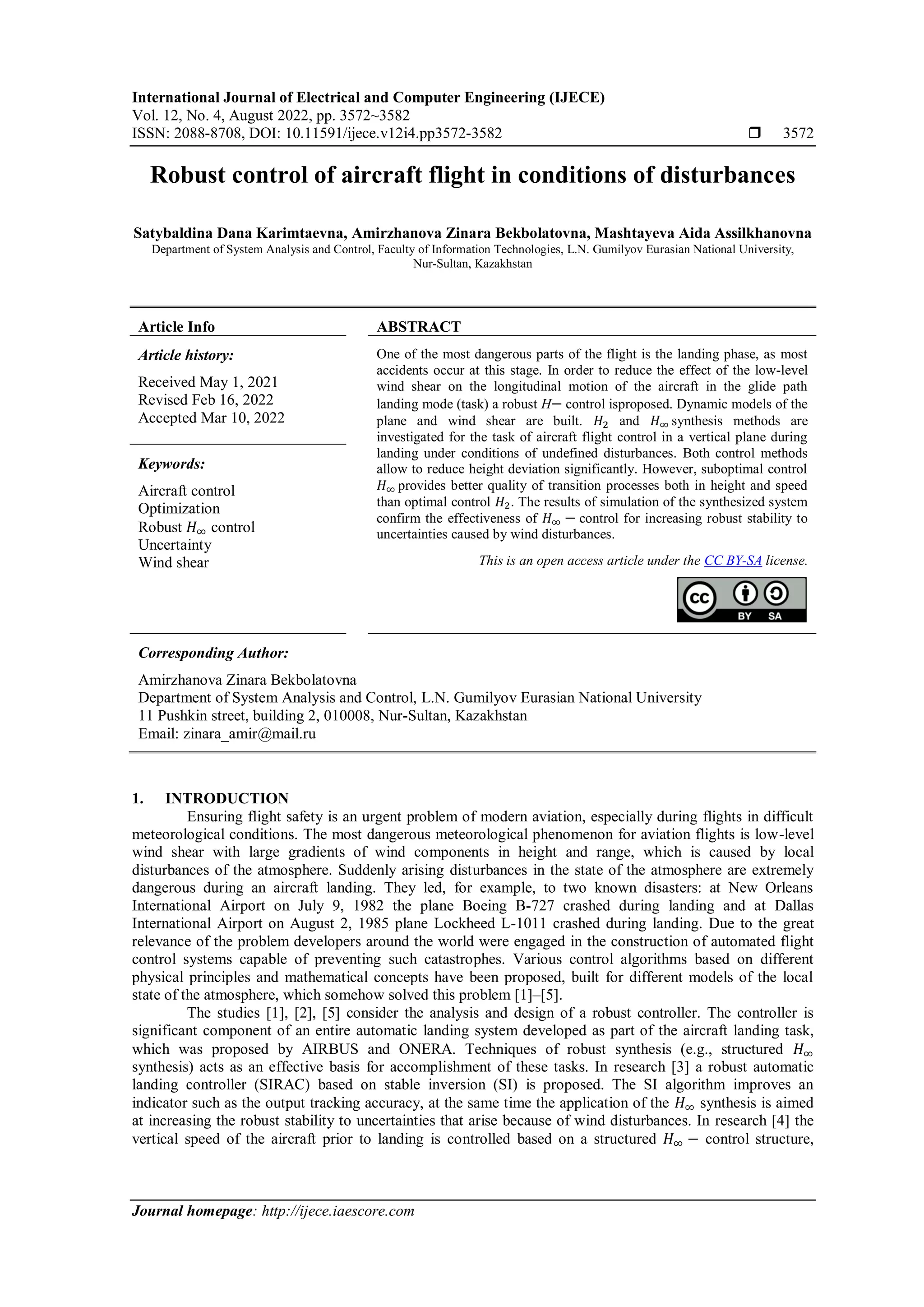 The document discusses the implementation of robust H-infinity (H∞) control techniques for aircraft landing to mitigate the effects of low-level wind shear, which poses significant risks during landing phases. It evaluates the effectiveness of both H2 and H∞ control methods, showing that H∞ control offers superior stability and transition quality during landings affected by unpredictable disturbances. Simulation results demonstrate the H∞ control's efficacy in enhancing robust stability against wind-induced uncertainties.