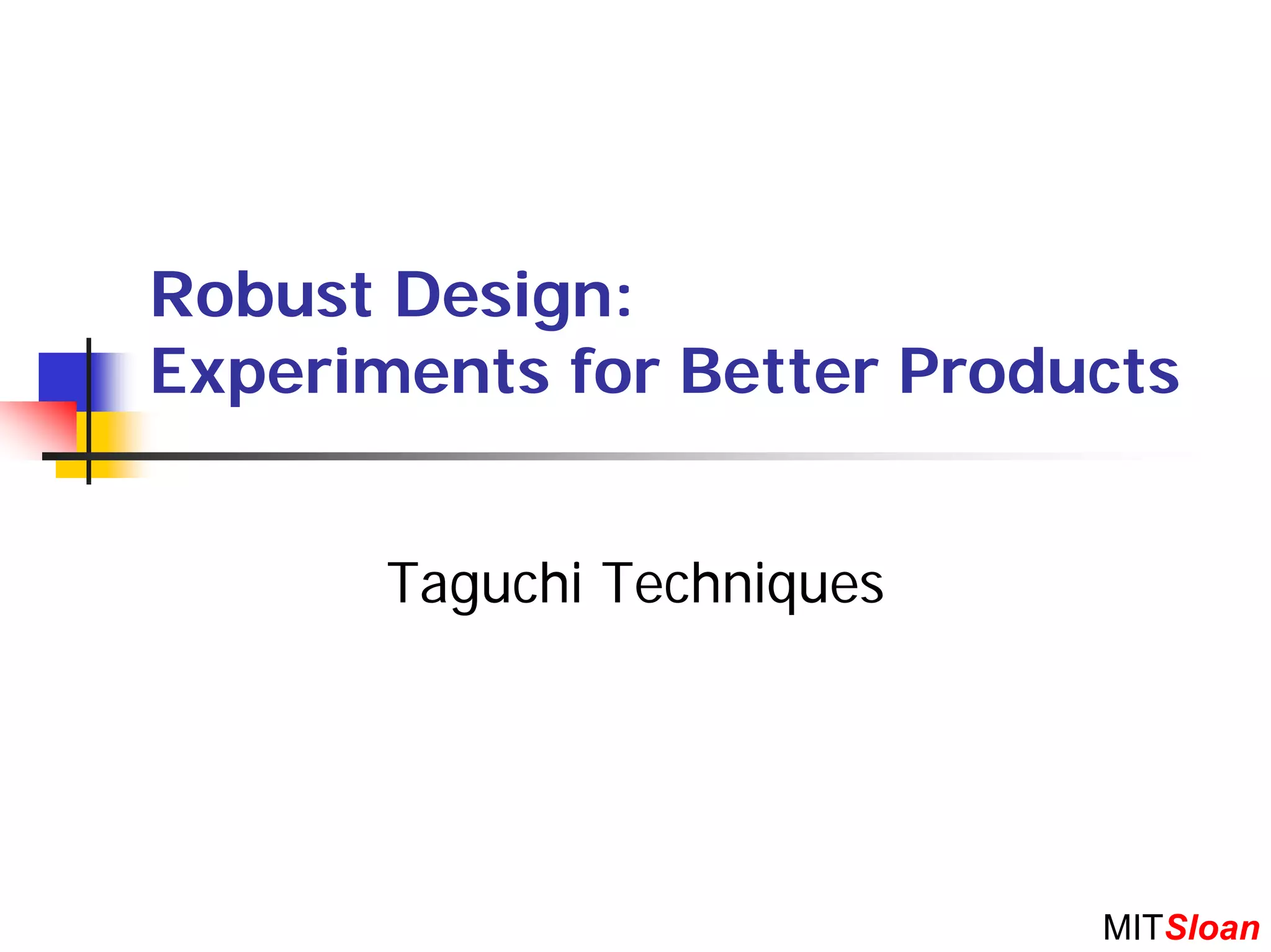 The document discusses Taguchi techniques for robust design and quality engineering. It describes the parameter design procedure which involves: (1) defining controllable parameters, uncontrollable noise factors, and measurable responses; (2) selecting an objective function to optimize; (3) planning experiments such as full factorial, fractional factorial, or orthogonal arrays; (4) running the experiment; (5) analyzing results to identify optimal parameter settings; and (6) selecting setpoints and conducting additional experiments if needed. The goal is to design products and processes that perform well even in the presence of uncontrollable noise factors.