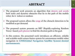 The document outlines a proposed algorithm for mobile robot navigation in GNSS-denied environments, focusing on detecting and avoiding obstacles using a multi-sensor fusion approach. It highlights the use of a rapidly-exploring random tree (RRT) algorithm for optimal path planning and addresses known issues in existing systems, such as landmark ambiguity and poor angular resolution. The proposed framework aims to enhance autonomous navigation by integrating various sensory data for accurate localization and collision-free pathfinding.