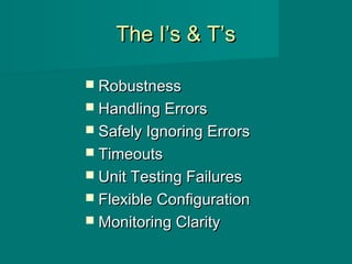 The document discusses robust software development practices, focusing on error handling, exception safety, and unit testing failures. It emphasizes the importance of managing unexpected behavior through appropriate exit codes, try-catch blocks, and exception-safe code. Additionally, it touches on flexible configurations, monitoring clarity, and strategies for handling cancellable operations.