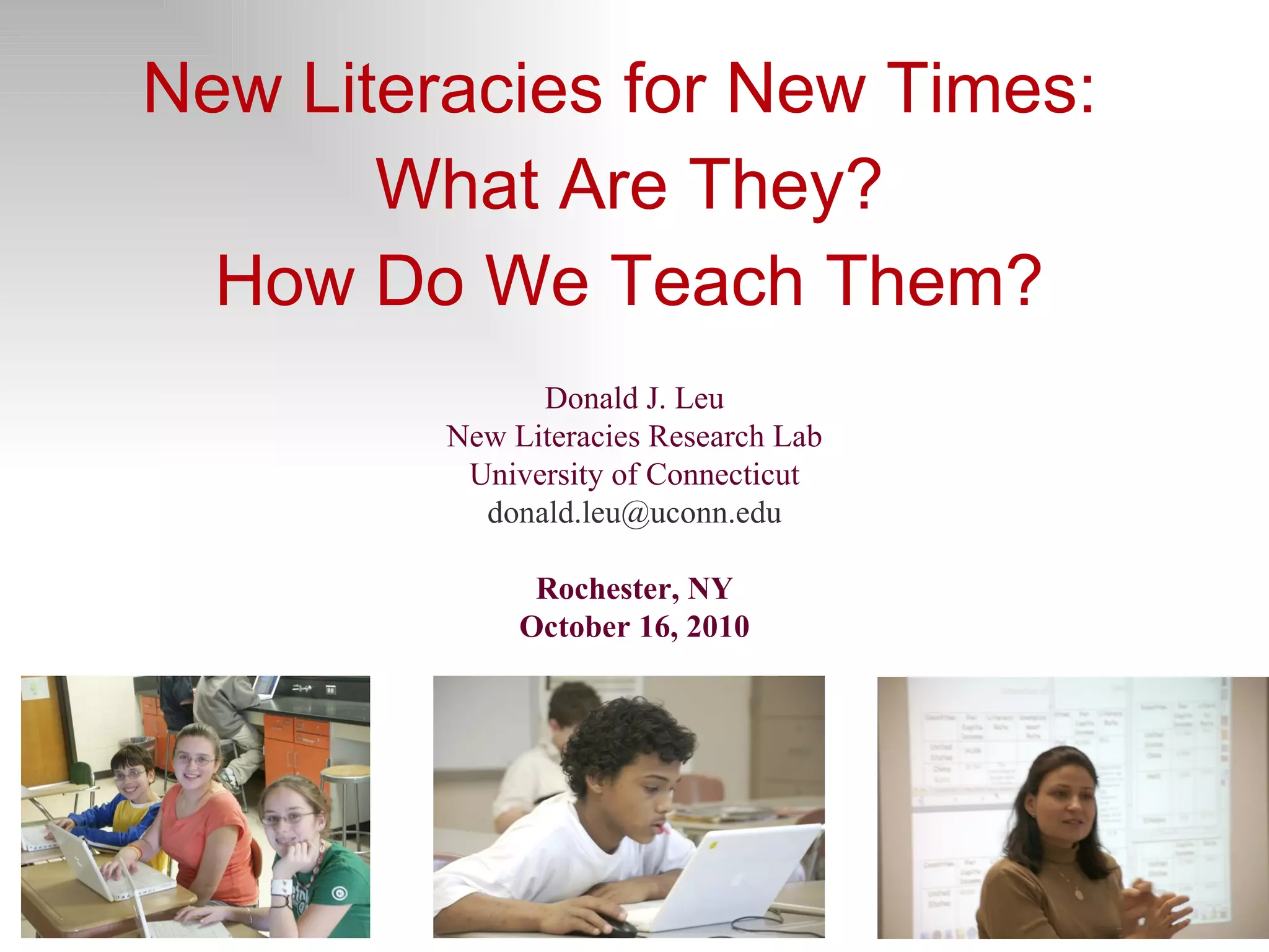 The document discusses new literacies required for reading and learning on the internet. It argues that internet reading requires additional skills beyond offline reading. Research shows a weak correlation between offline and online reading comprehension, indicating they involve different skills. The document advocates updating education standards and assessments to reflect the new literacies of online reading comprehension and problem-based learning.
