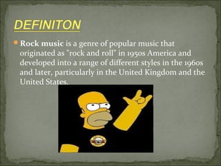Rock music originated in the 1950s as rock and roll and developed into various styles, centered around the electric guitar, bass, and drums. Early influential rock artists included Elvis Presley, Chuck Berry, and Little Richard. In the 1960s, rock was influenced by R&B, surf rock, and rockabilly, and important bands emerged like The Rolling Stones and The Beatles. Rock continued evolving in the 1970s with artists such as Jimi Hendrix, Bob Dylan, and Led Zeppelin, and subgenres like heavy metal and punk rock developed in later decades.