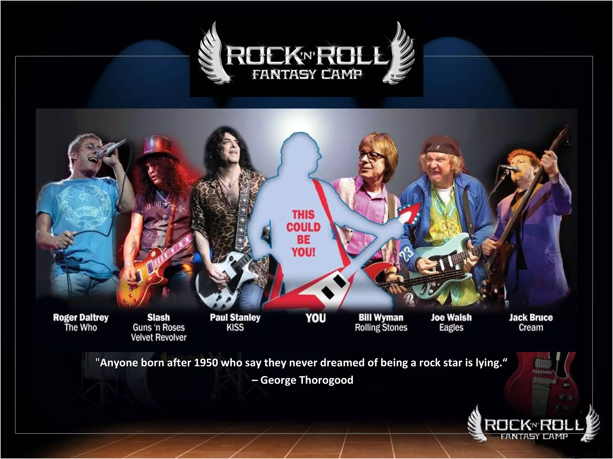 Rock 'n' Roll Fantasy Camp (RRFC) offers music lovers a chance to play alongside rock legends, providing a unique experience of jamming, recording at famous studios, and performing live at iconic venues. The camp includes master classes, Q&A sessions with rock stars, and creates lasting bonds among participants while also supporting music-related charities. A reality TV series produced by Mark Burnett is set to showcase this unforgettable experience in 2010.