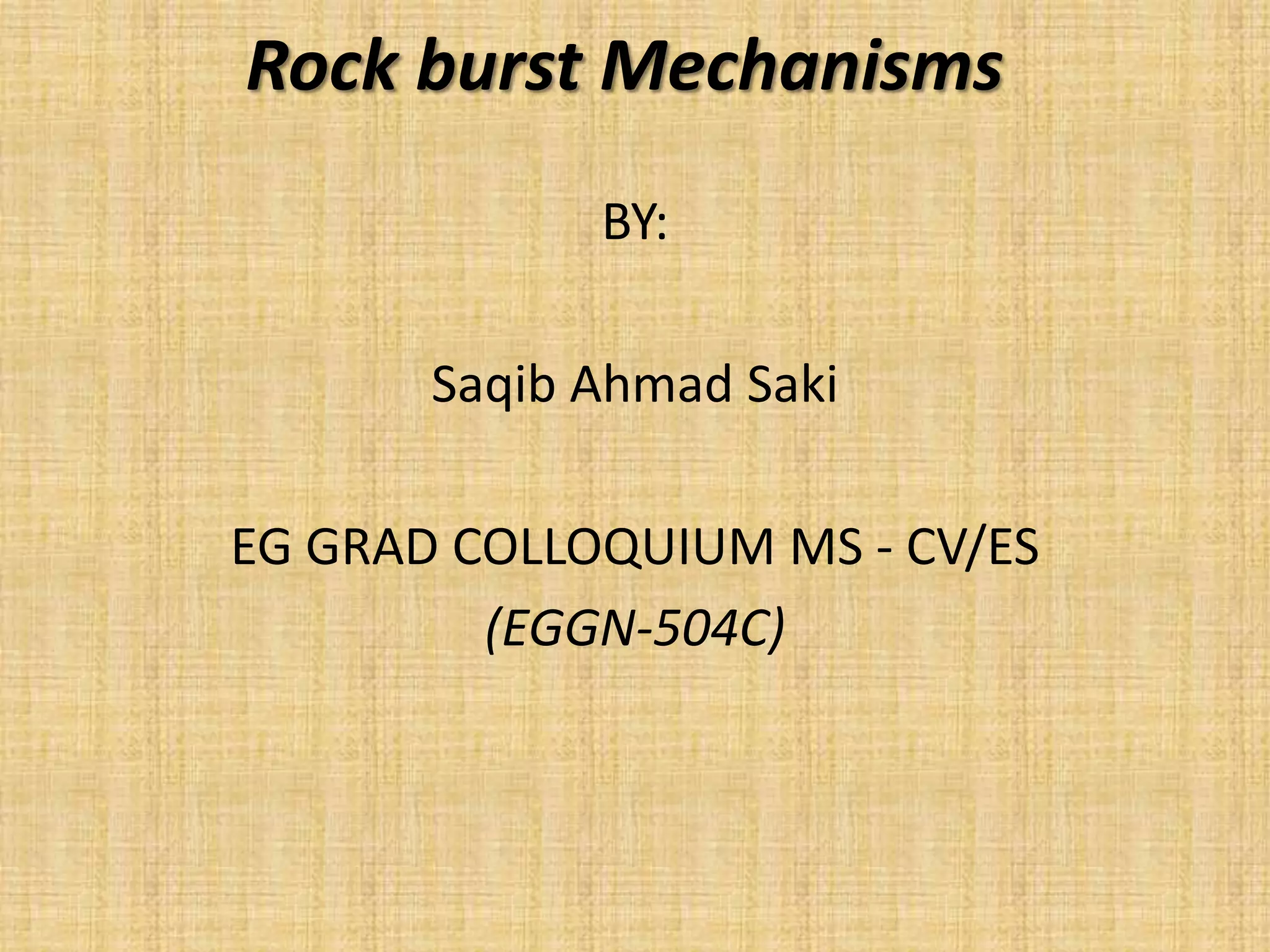 1) Rock bursts occur due to the violent release of strain energy stored in rock mass in underground excavations under high stress. They can be caused by stress redistribution around excavations or reactivation of geological discontinuities.