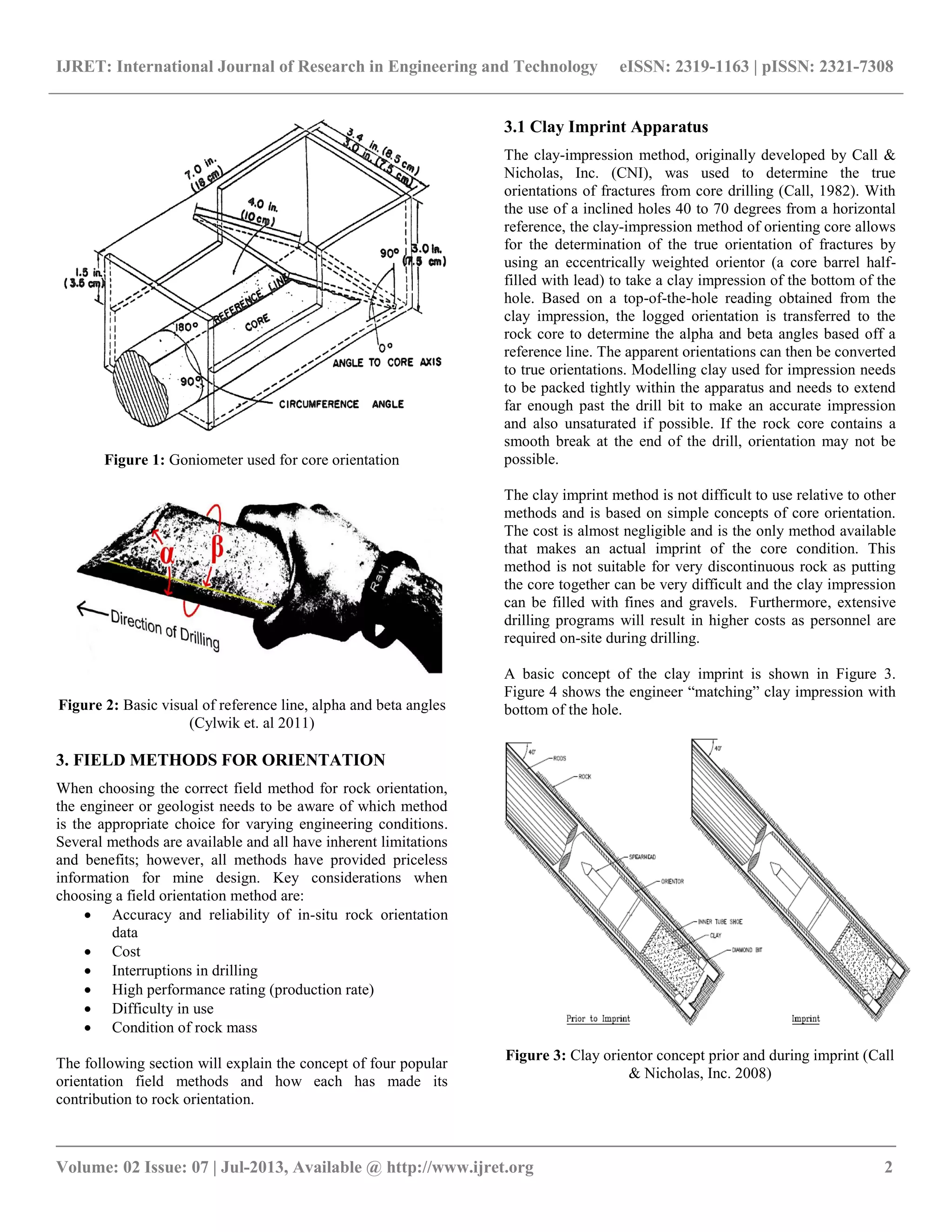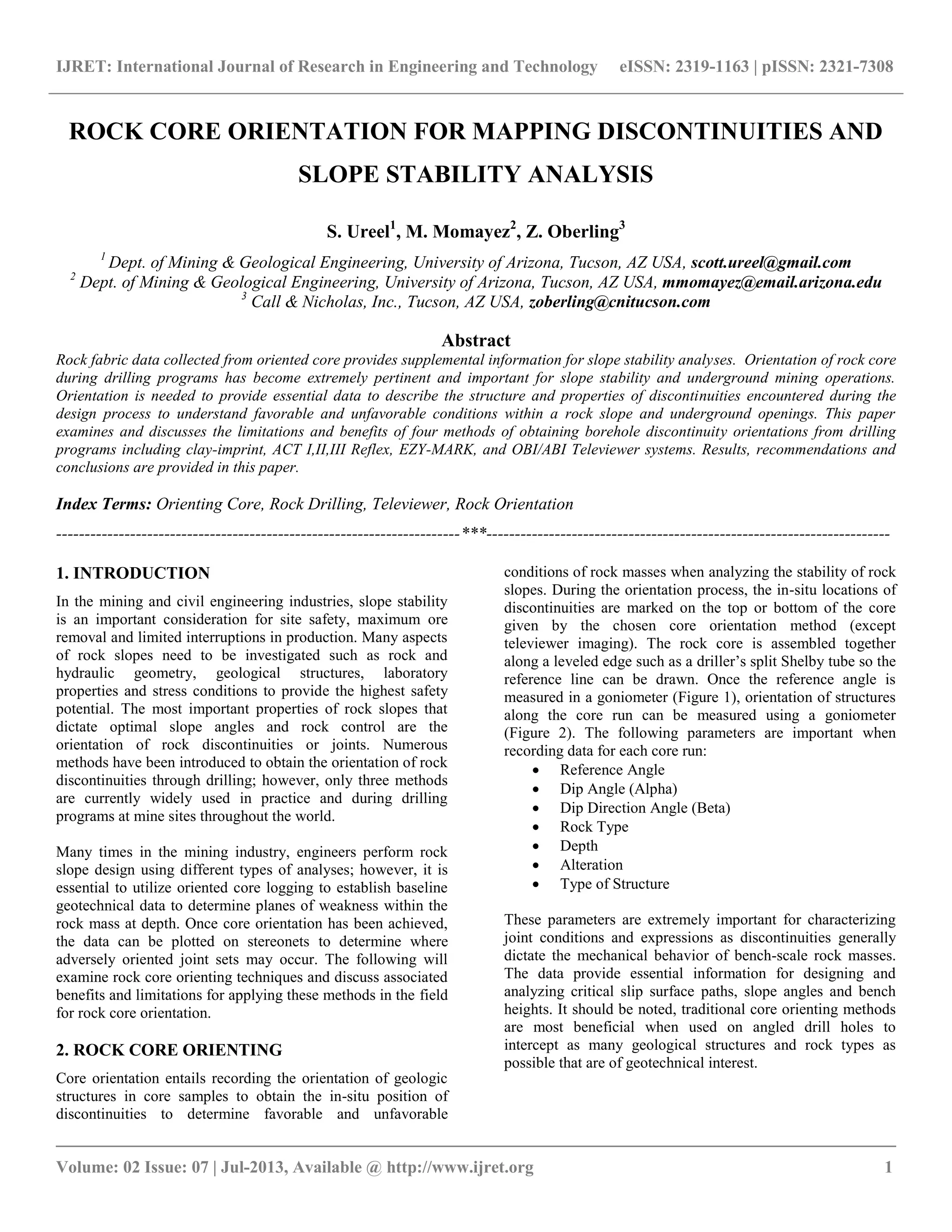 This document discusses methods for orienting rock core to determine the orientation of discontinuities for slope stability analysis. It examines four main methods: clay imprint, EZY-Mark, ACT Reflex, and televiewer imaging. Each method has benefits and limitations for accurately obtaining orientation data from borehole cores. The document provides details on how each method works and when they are best applied based on factors like cost, ease of use, accuracy, and drilling interruptions. It emphasizes that oriented core data is important for characterizing rock mass weaknesses and designing safe rock slopes.