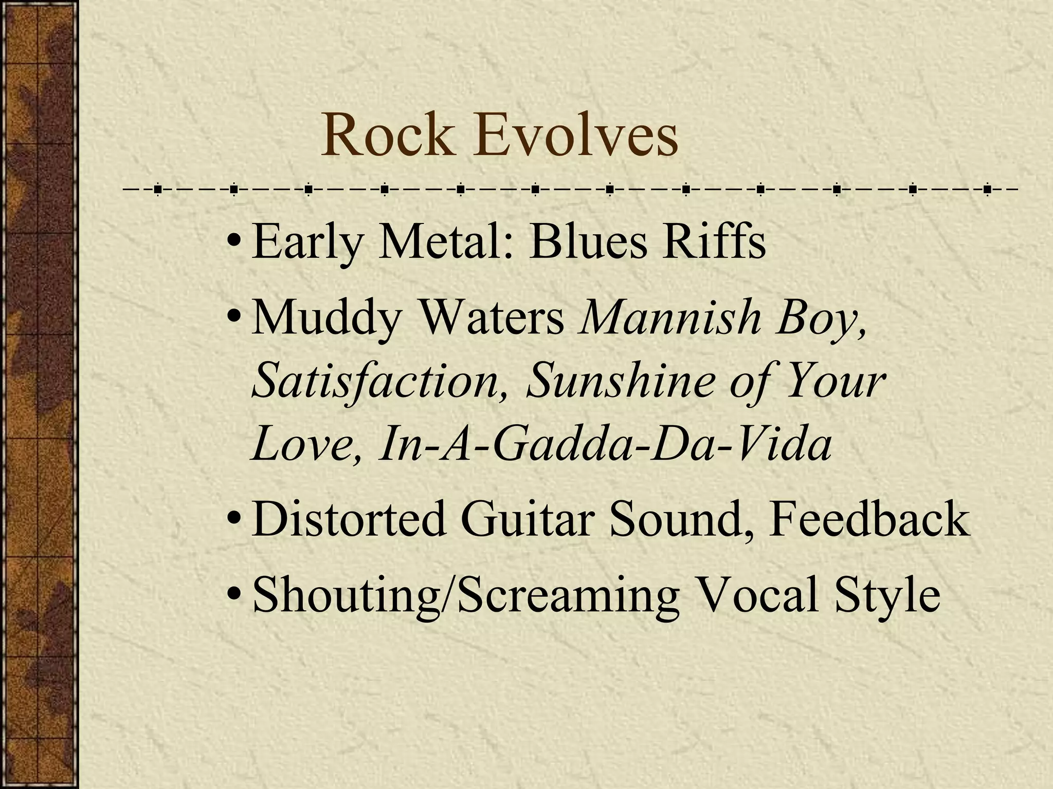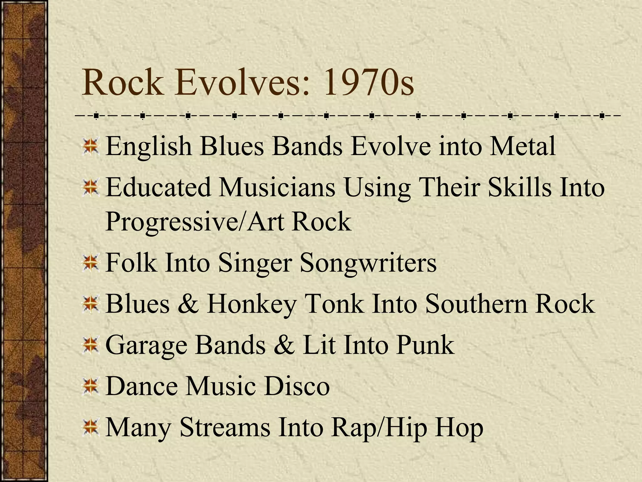This document summarizes the evolution of various rock music genres in the 1970s. It describes how blues bands in England evolved into early metal bands with distorted guitar sounds and screaming vocals. It also discusses the rise of progressive/art rock bands that experimented with classical music influences and longer song structures, as well as the emergence of punk rock bands that reacted against over-produced disco with a rawer amateur sound. Additionally, it outlines the development of rap/hip hop from influences like Jamaican DJs and beat poetry in the Bronx.
