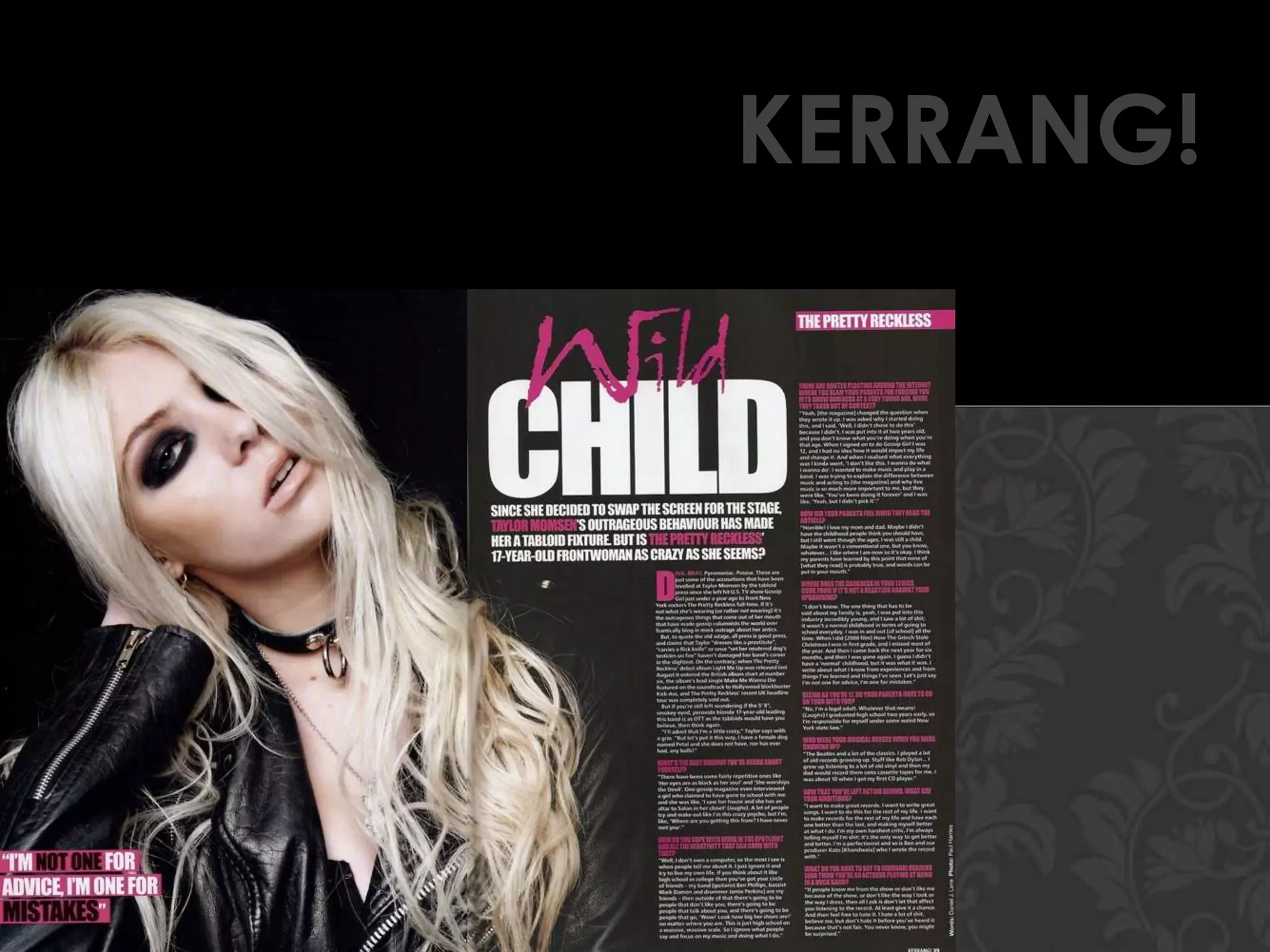 This document analyzes the design elements of two magazine double page spreads (DPS). For the first DPS profile of Taylor Momsen: the font, colors and layout are used to convey a sense of innocence, attitude, strength and feminism fitting her persona. For the second DPS on Blink-182: the large font, yellow highlighting and long tagline suggest a celebration of their return, while the continuous prose interview style appeals to a more mature audience. Overall design elements are analyzed for the connotations and how they fit the profiled musicians and target audiences.
