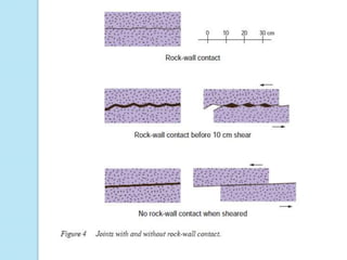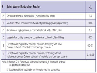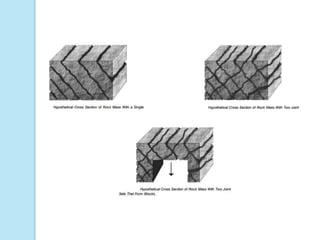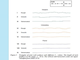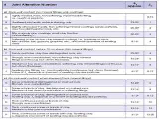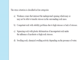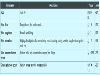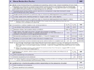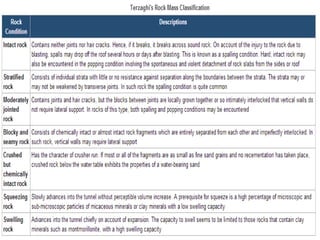 The document presents an overview of rock mass classification systems, focusing on their development, applications, and specific schemes such as Terzaghi's system, Rock Mass Rating (RMR), and Barton et al.'s Q system. It explains the parameters used for classification and their significance in engineering projects, particularly in tunnel design and stability assessments. Additionally, it highlights the limitations of these classification systems and their adaptations for mining and other engineering purposes.
