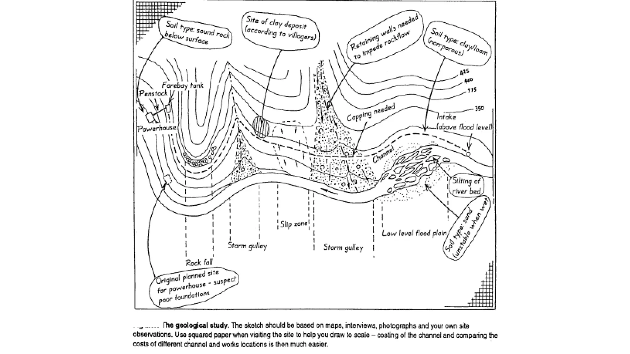 • The suitability of local rocks and soils, especially those to be excavated, as construction