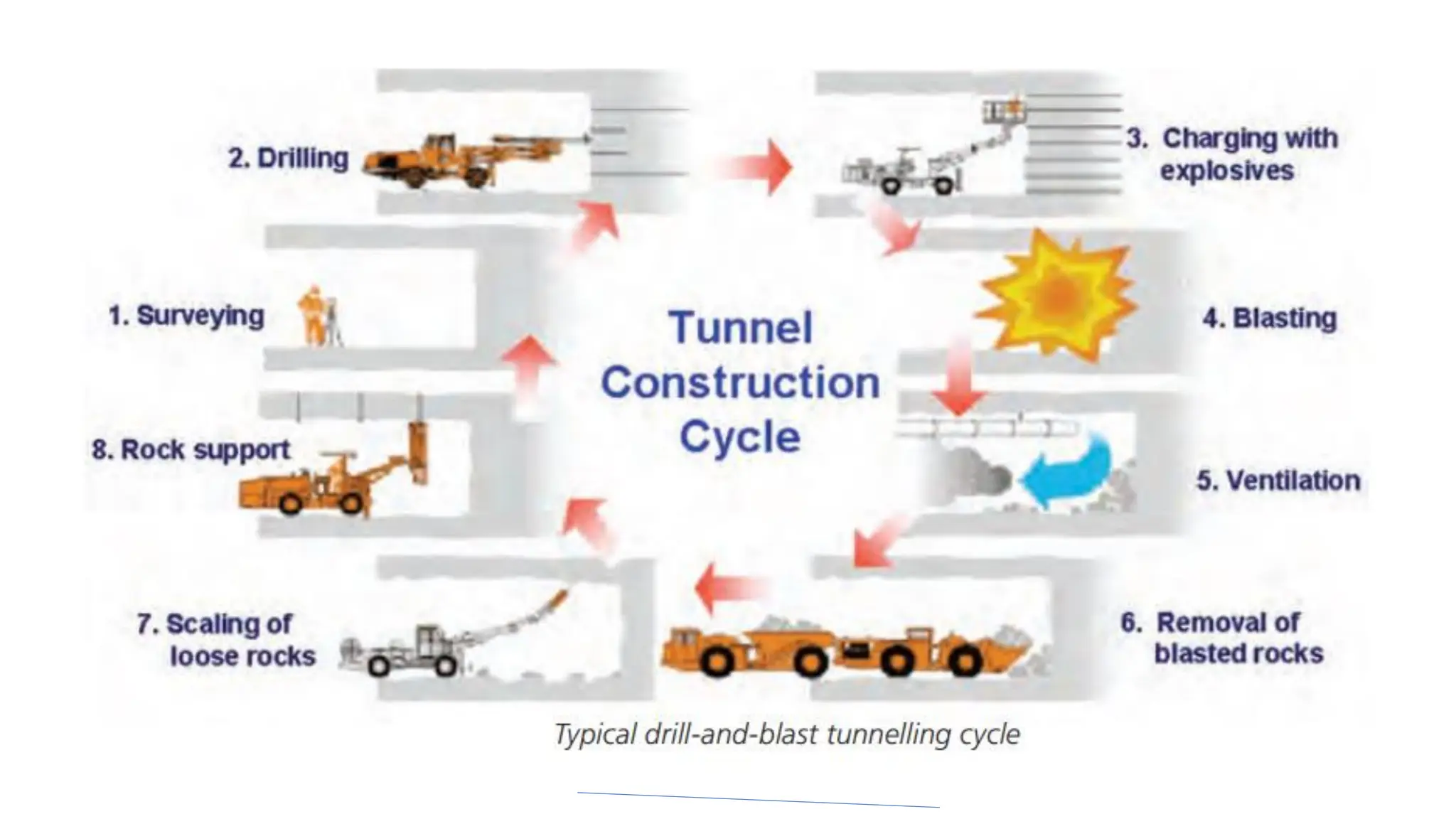 Once blasting is carried out, waste rocks and soils are transported out of the tunnel before further
