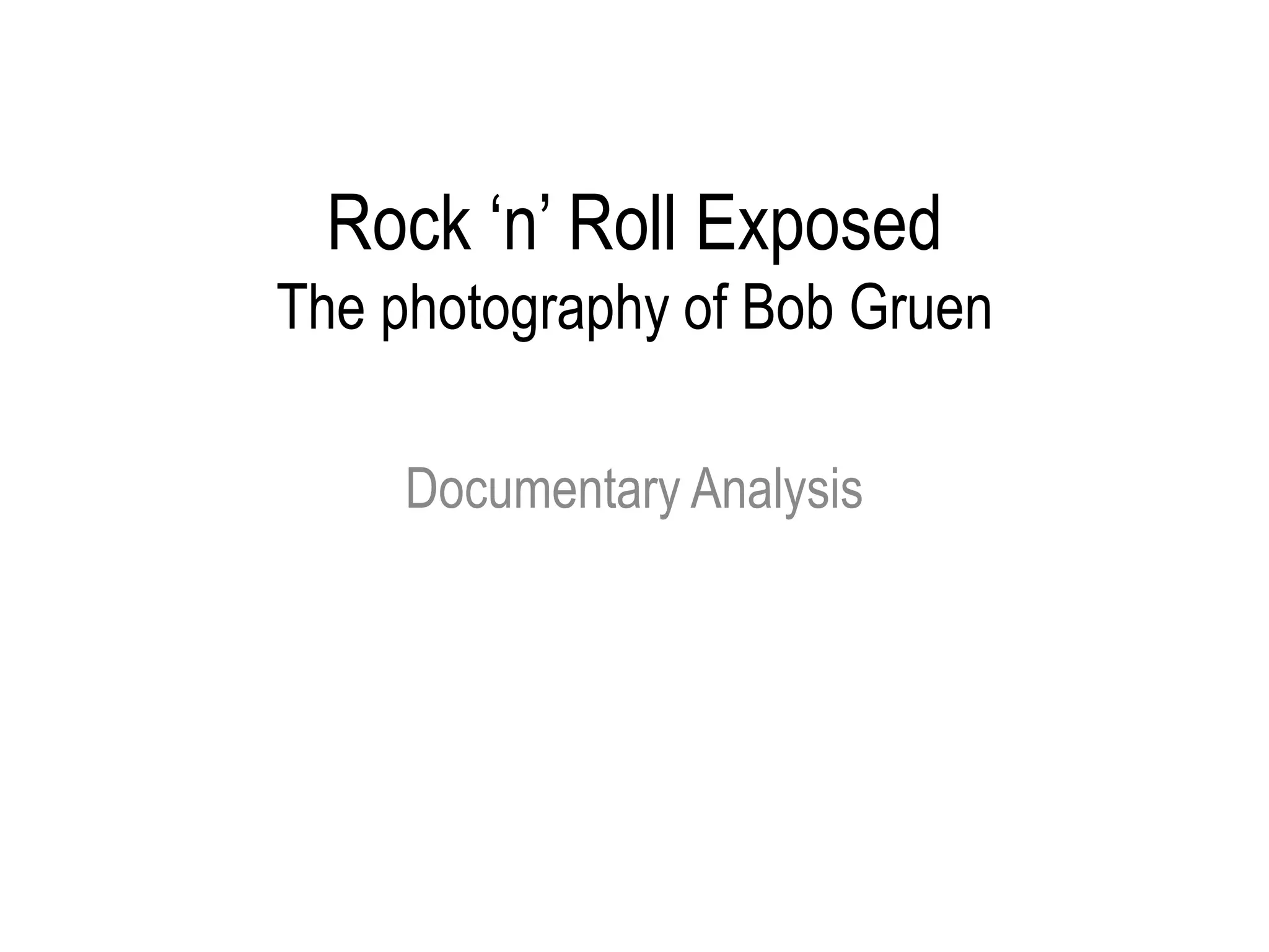 This documentary analyzes Bob Gruen's photography career through interviews with Gruen and others in the music industry. It uses a non-linear structure and multiple camera shots to keep the audience engaged. Interviews are edited together with relevant photographs and music to tell the story without needing voiceover. The documentary focuses on documenting the change in pop culture and society through Gruen's photos of bands like the New York Dolls and Green Day.