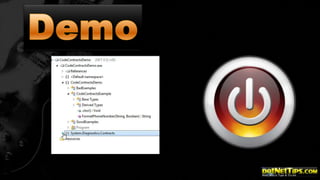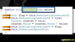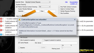 This document contains information about conference DVDs and an introduction to code contracts in .NET. It summarizes that code contracts are a way to define preconditions, postconditions, and class invariants for software components to specify their interfaces and ensure correctness. It provides examples of using the System.Diagnostics.Contracts namespace in C# to add preconditions and postconditions to methods. Contracting types can make them more robust by validating arguments and object states.