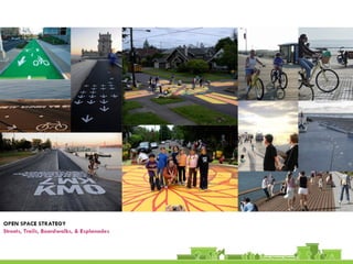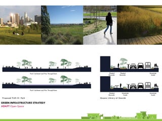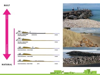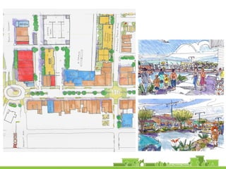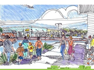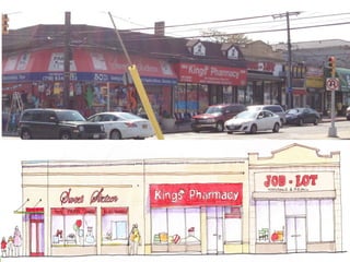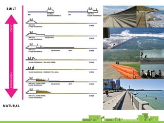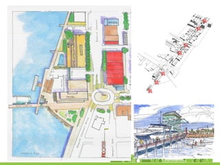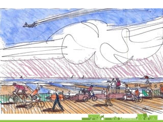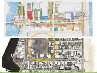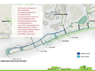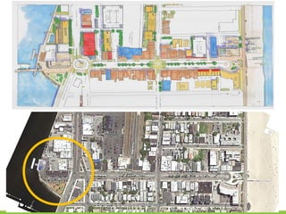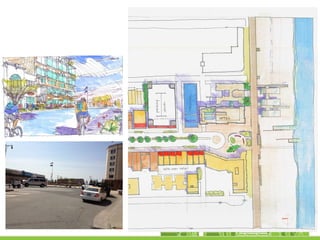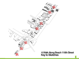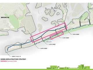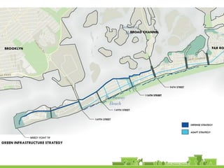 The document discusses revitalization plans for The Rockaways in Queens, New York after Hurricane Sandy. It proposes focusing development around Beach 116th Street, including a potential ferry terminal there. Other recommendations include improving multi-modal transportation connectivity in the area, creating a tax increment financing district, and transforming key sites like a parking lot into mixed-use developments. The overall goal is to strengthen the community and local economy through new infrastructure, housing and businesses while maintaining affordable options for current residents.
