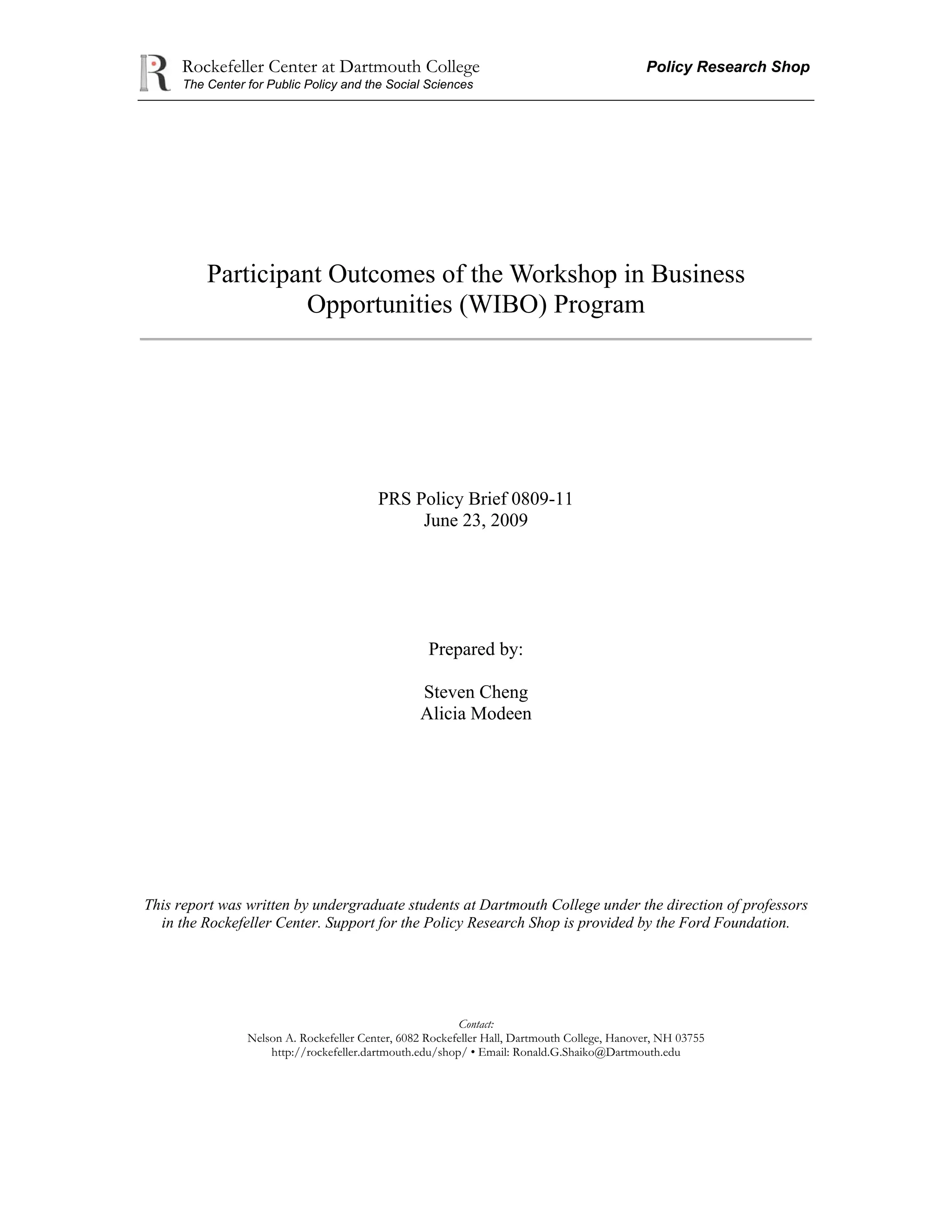 This document summarizes a study of outcomes for participants in the Workshop in Business Opportunities (WIBO) entrepreneurship training program in Bridgeport, Connecticut. The study interviewed 80 alumni from 1999 to 2008 and found that: