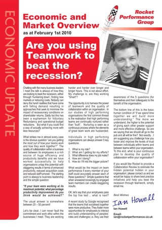 The document discusses the economic outlook as of February 1, 2010, highlighting the challenges businesses face due to recession and the importance of teamwork in overcoming these obstacles. It provides key economic data, including inflation rates, employment status, and housing market trends, while emphasizing the need for effective collaboration and nurturing high-performing teams to improve productivity. Additionally, it touches on the potential for positive economic developments and recovery signs in the UK housing market and suggests strategies for businesses to enhance team dynamics.