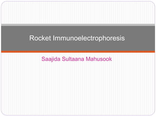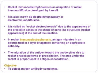 Rocket immunoelectrophoresis is a quantitative technique used to detect antigen-antibody complexes. It involves placing antigen samples in wells cut into an agarose gel containing immobilized antibodies. An electric current is passed through the gel, causing the antigens to migrate. As antigens interact with antibodies, precipitin lines form in the shape of cones or "rockets". The height of the rockets is proportional to antigen concentration, allowing quantification. Rocket immunoelectrophoresis is used to estimate protein concentrations and study antigenic relationships between organisms.