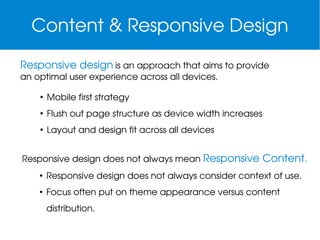 The document provides an overview of creating responsive content layouts using panels in web design, focusing on mobile-first strategies and the effective distribution of dynamic content across devices. It discusses the use of custom panel layouts, WYSIWYG layout builders, and the implementation of breakpoints for optimal experience across varied screen sizes. Additional resources and examples are included for creating and configuring layouts using tools like Singularity and Drupal.