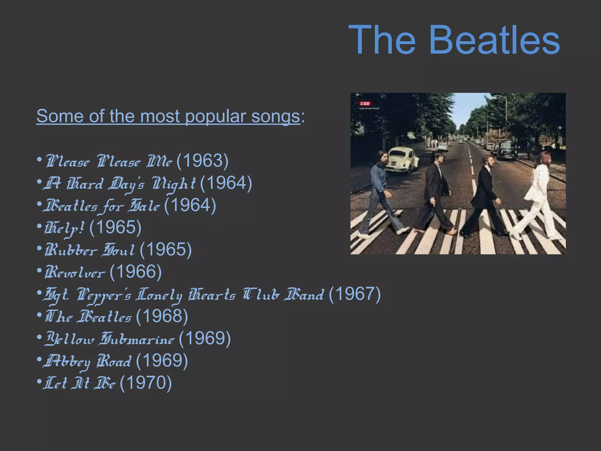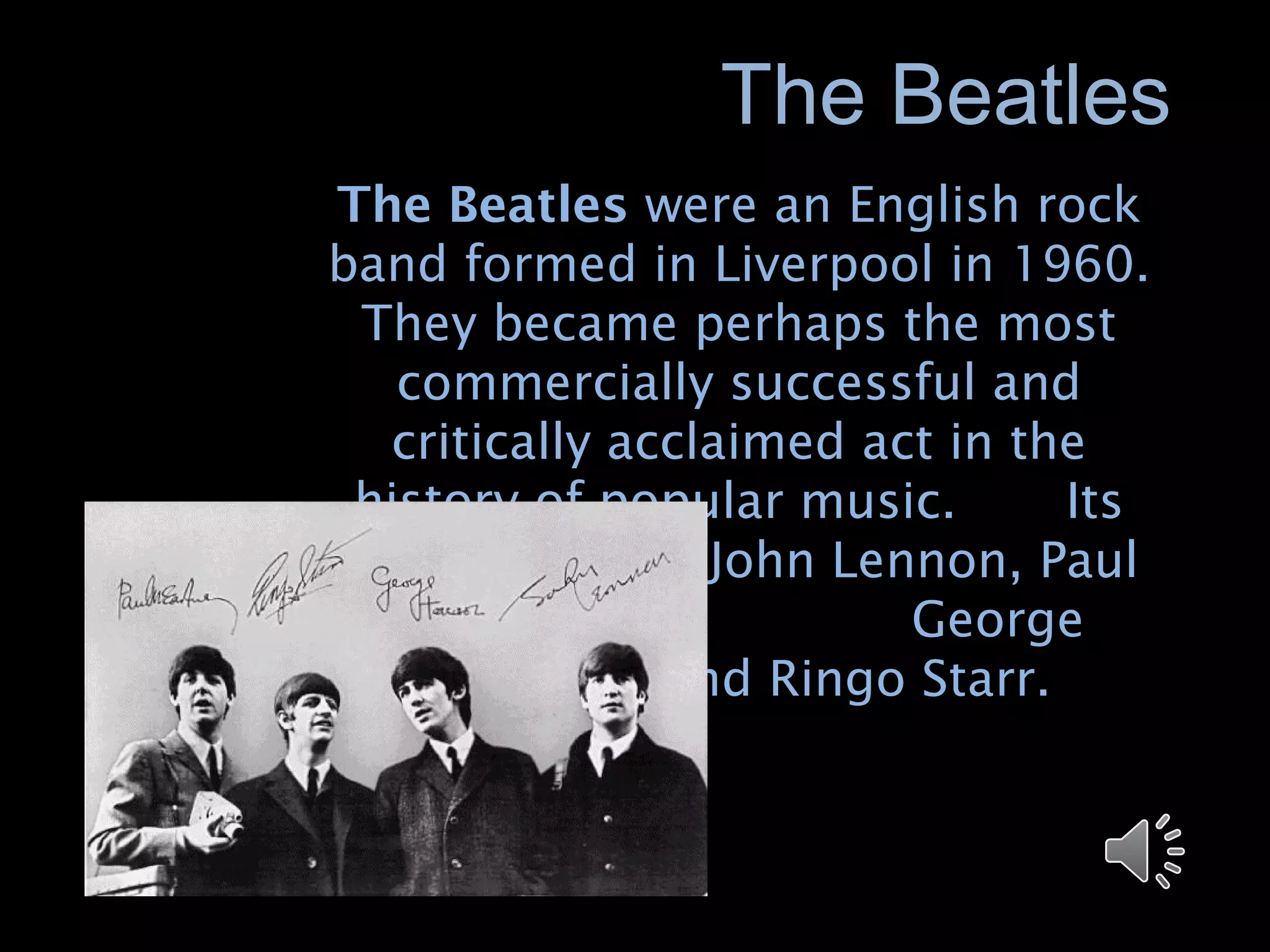 The Beatles were a highly successful English rock band formed in 1960 in Liverpool consisting of John Lennon, Paul McCartney, George Harrison, and Ringo Starr. They became one of the most commercially successful and critically acclaimed bands of all time, producing many popular songs between 1963-1970 such as "Please Please Me", "Hey Jude", and "Let It Be".