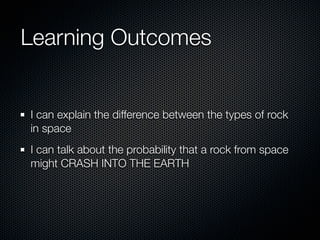 There are different types of rocks that can be found in space, including rocky planets like Earth that are large balls of rock, dwarf planets that are smaller rocky bodies, moons which are rocks that orbit planets, and asteroids and comets which are small rocks and mixtures of rock and ice that orbit the Sun. Meteoroids are small rocks in space that can enter the Earth's atmosphere as meteors, and any pieces that reach the ground are called meteorites.