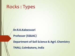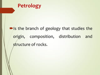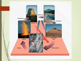 This document summarizes the three main types of rocks: igneous, sedimentary, and metamorphic. Igneous rocks form from the cooling and solidification of magma either below the surface (intrusive) or above (extrusive). Sedimentary rocks form through the compaction and cementation of sediments. Metamorphic rocks were once igneous or sedimentary rocks that were changed by heat, pressure, and chemical fluids within the Earth. Examples of each rock type are provided along with brief descriptions of their characteristics and formation processes.