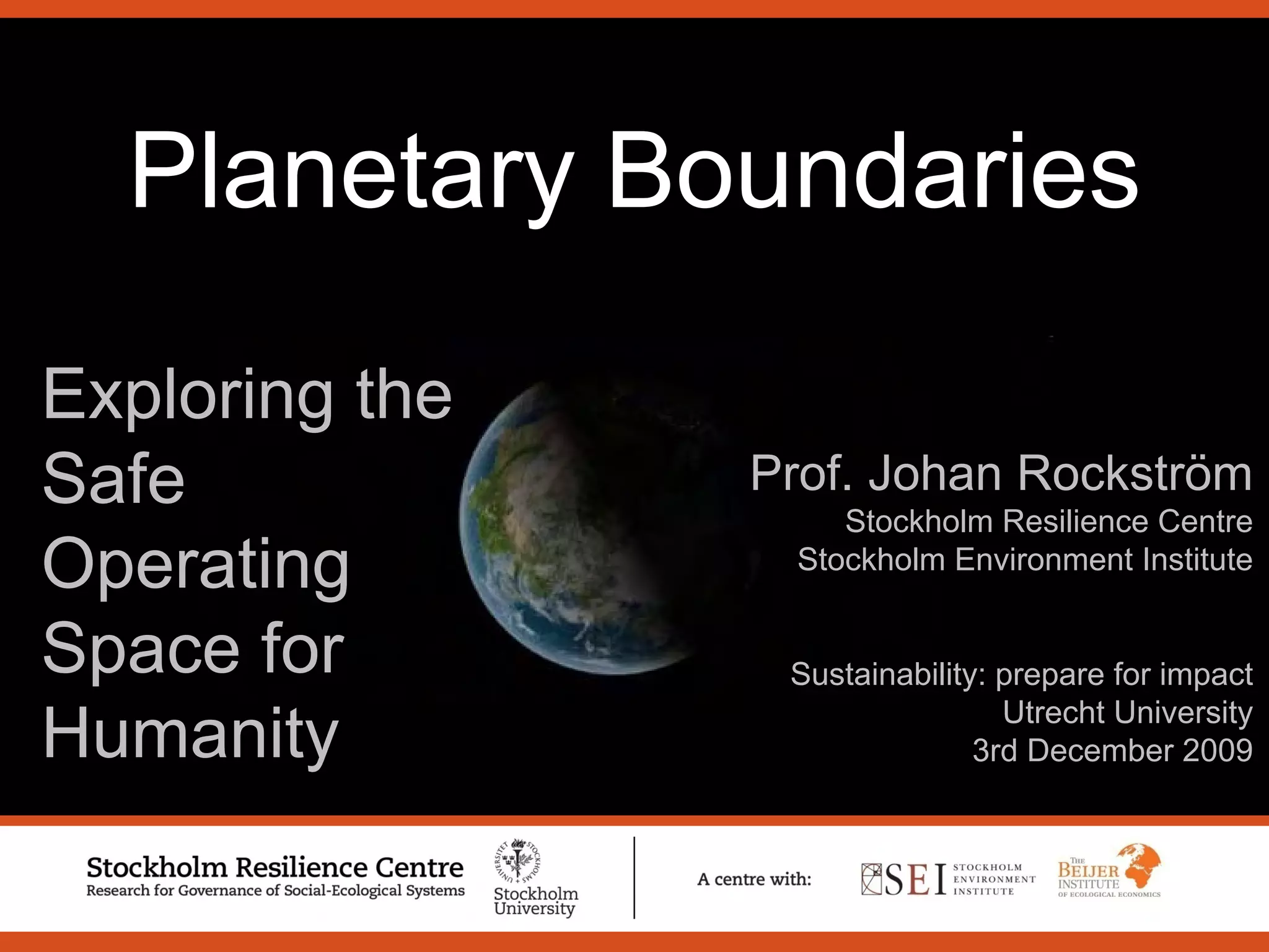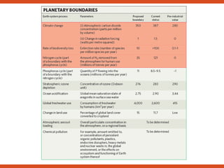 1) The document discusses the concept of "planetary boundaries" which aims to define a "safe operating space for humanity" by establishing quantitative boundaries for nine critical Earth system processes.
