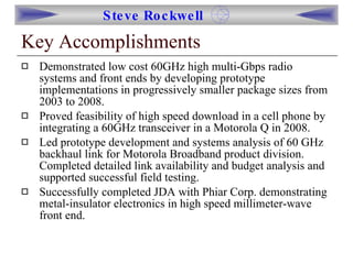 This document provides a summary of the experience and expertise of Steve K. Rockwell in RF/microwave/mm-wave design, including: