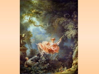 This document discusses several Rococo paintings and the artists that created them. It contrasts the styles of Rubenisme and Poussinisme, with Watteau embracing Rubenisme's emphasis on color and movement. Key paintings mentioned include Watteau's Return From Cythera, Boucher's Cupid a Captive which took after Watteau's style, and Fragonard's The Swing which depicted a sensual scene. Chardin's Grace at Table is also summarized as depicting ordinary scenes with simplicity and light/dark contrasts.