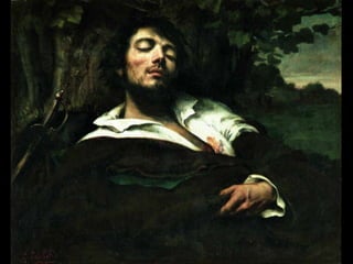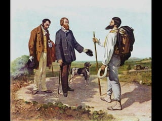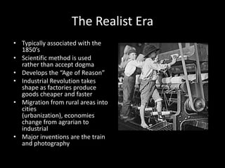Realism was an artistic movement that developed in the mid-19th century in response to industrialization and urbanization. Realist artists aimed to depict ordinary people and everyday subjects based on close observation of reality rather than idealization. They sought to reveal the truth of contemporary social conditions, influenced by scientific empiricism and Marxist views of class struggle. Gustave Courbet was a leading French realist who painted scenes of working class life. In America, Thomas Eakins painted realistic portraits and scenes focusing on anatomy and the human form. The development of photography also prompted discussion about the purpose of art. Some artists embraced or were inspired by photography while others reacted against its realism.