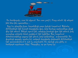 Ես ճամփորդել շատեմ սիրում: Դա շատ լավ է: Բայց տեսեք մի անգամ ինձ հետ ինչ պատահեց… Երբ ես գնացքից իջա, հայտնվեցի թարս իրերի քաղաքում: Այնտեղ մեքենաներն էին նստած մարդկանց վրա, իսկ ծառերը արմատները դեպի վեր էին աճում: Տներն օդում էին, ամպերը խոտերի վրա էին աճում, իսկ աստղերը անձրևի նման թափվում էին երկնքից: Այս քաղաքում մեծահասակները դպրոց էին գնում, իսկ երեխաները` աշխատանքի: Ես փորձեցի պարզել որտեղ եմ, սակայն մարդկանց փոխարեն մեքենաներն էին պատասխանում և այն էլ թարսերեն: Ես սկսեցի լաց լինել ու հանկարծ արթնացա քնից: Պարզվեց, որ դա երազ էր: