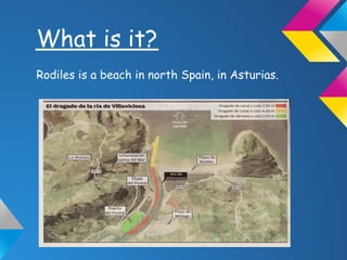 Rodiles is a 1,000 meter long beach located in northern Spain's Asturias region known for its production of cider. It is a sunny and windy beach with some of the largest waves in the world, making it a popular spot for surfing. Visitors can access the beach by foot or car and find amenities like washrooms, parking, showers, and rescue services, as well as a surf school for learning to catch the big waves.