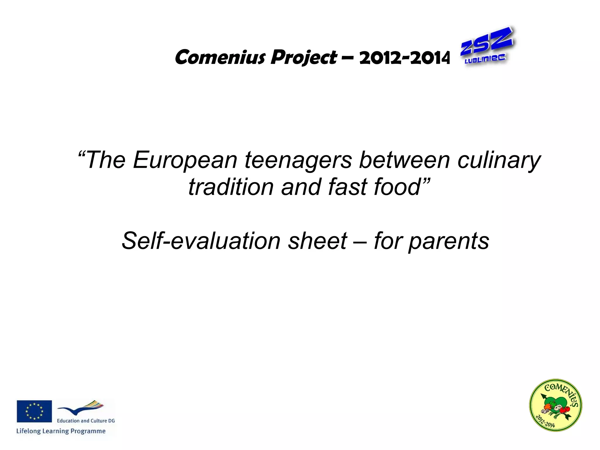This document is a self-evaluation sheet for parents regarding their child's involvement in the "Comenius Project" from 2012-2014. The project focused on European teenagers and culinary traditions versus fast food. Based on the evaluation, parents gave high marks to their child's participation in the project, hosting a foreign student, learning about healthy habits and other cultures, and developing national identity through appreciation of their own culture.