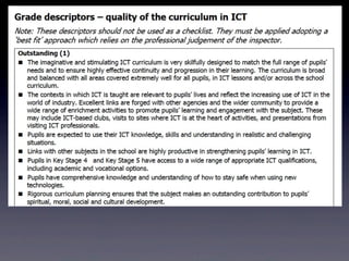 The document provides an overview of the computing curriculum in England, including aims, key stages, and learning objectives. At key stage 1, students will learn about algorithms, basic programming, data storage and retrieval, and online safety. At key stage 2, they will design and write programs, use logical reasoning, understand computer networks and the internet, use search engines effectively, and collect/analyze data. At key stage 3, topics include computational modeling, algorithms, programming languages, Boolean logic, computer systems, and data representation.