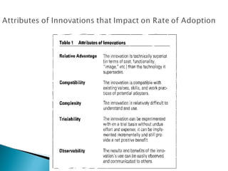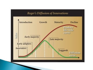 Everett Rogers developed the Diffusion of Innovations Theory to predict how new ideas and technologies are adopted by different groups over time. The theory has been applied across many fields and proposes that adoption follows an S-shaped curve, with innovators, early adopters, early majority, late majority, and laggards adopting at different stages. It also describes how these groups differ in their openness to new ideas and their willingness to adopt innovations early.