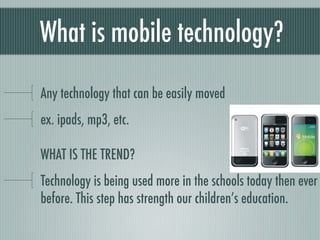 Mobile technology refers to any portable devices like iPads and mp3 players. While technology has strengthened education, its introduction caused issues like cyberbullying and sexting. However, studies show that technology improves student achievement in core subjects and helps teachers meet requirements. It also promotes equity and access. To maximize benefits and prevent misuse, schools should have technology policies and provide teacher training on appropriate mobile device integration.