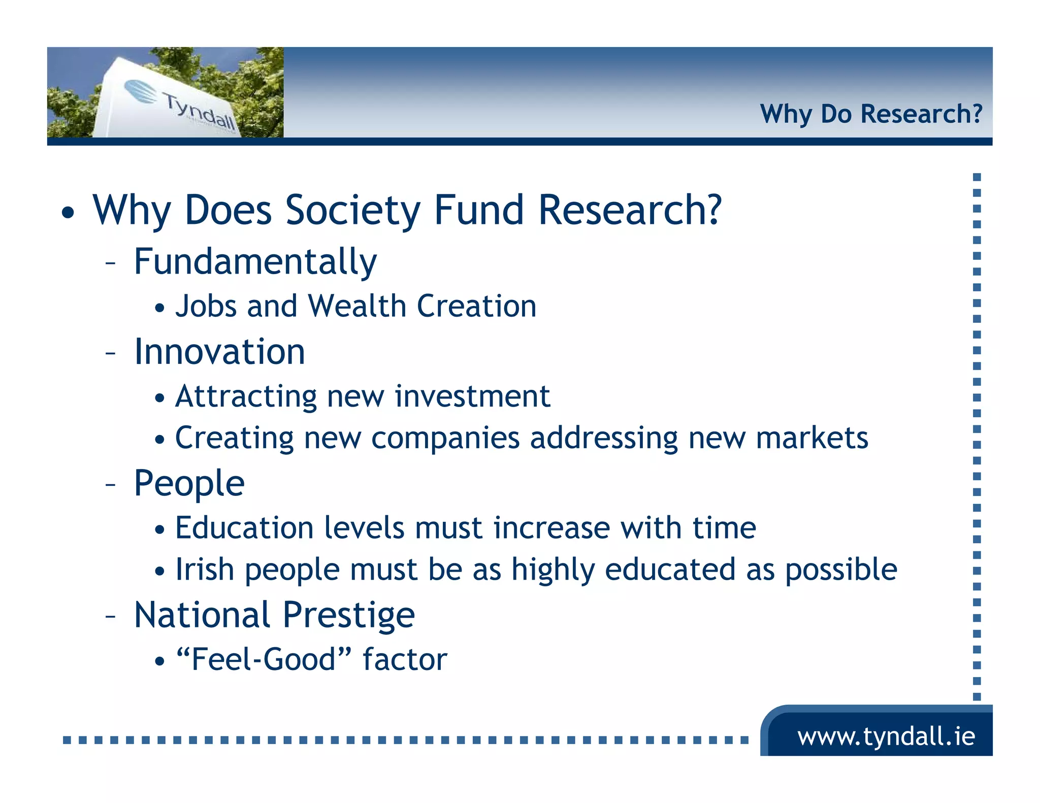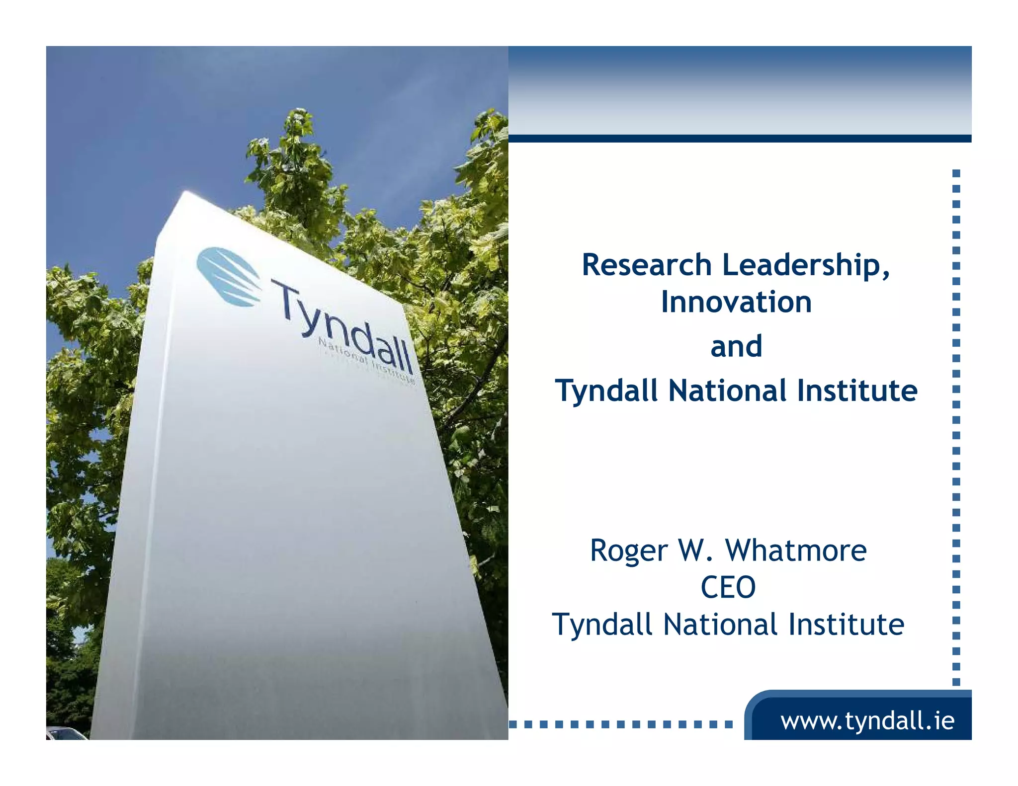 The document discusses the role of Tyndall National Institute in advancing research and innovation within Ireland, emphasizing the importance of a highly educated workforce and collaboration with industries. It introduces concepts of closed and open innovation, outlining Tyndall's research activities in various fields such as photonics and microelectronics, and its contributions to societal challenges like energy and health. The institute's achievements include significant partnerships, successful spinouts, and advancements in technology that address both industrial needs and academic research goals.
